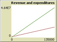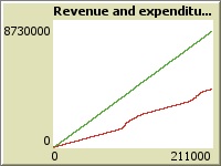 Last runs of the simulation aimed to increase margin profit by decreasing number of maintainers and slightly increasing number of cars comparing to the best scenario (200 cars per 1,000 users). It turned out that even one maintainer is enough to perform routine maintenance of the fleet. Number of cars waiting for maintenance grew but the profit in the end increased. Graph of car statuses looks similar to what was shown before with a extra red ("need maintenance" status) cars. On the other hand, revenue now exceeds expenditures 2.5 times (comparing to 2 times with 5 maintainers). It means that return of investments may happen already in 1.5-2 years.
