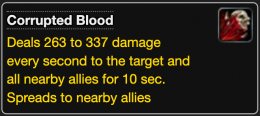 The Corrupted Blood original debuff informations. Debuff was changed many times during early phases of inicent.