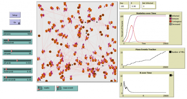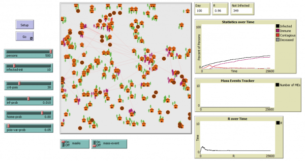 NetLogo is used for the simulation. This allows the representation of autonomous agents. Thus, pandemic behavior can be well represented in a situation where people/agents move differently in the daily routine. Hence, reality can be suitably represented in an abstracted model to show the specifics of a pandemic spread.