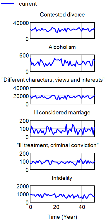 Firstly, there are the Micro causes of the divorce. All the causes will be simulated separately as the random normal. The parameters for this formula were calculated based on the obtained historical data. The Subcategory Contested divorce is calculated as the sum of the numbers of causes within the category and the total number of Micro causes of the divorce is calculated as the sum of the two subcategories.
