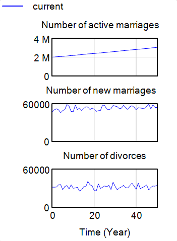 The simulation shows the number of the active marriages is rising in time, with the maximum of 3.05 million marriages at the end of the simulation, i.e., 50 years from 2021. The number of new marriages is relatively stable, between 45000 and 60000. The number of divorces is a little less stable than the number of new marriages, the value is between 25000 and 41000.