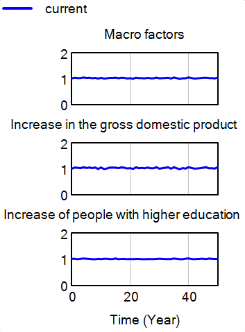 Macro factors describe the average of increase in the number of people with higher education and increase in the gross domestic product. Both increases were counted as the random normal, again based on the yearly historical data. Average of these two parameters was calculated as their sum divided by two.
