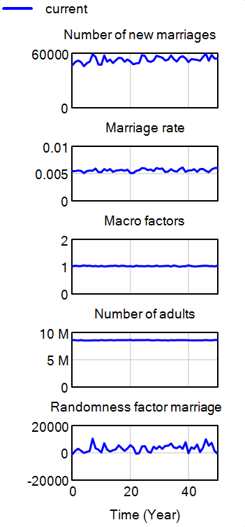 Number of marriages = Marriage rate * Macro factors * Number of adults + Randomness factor marriage