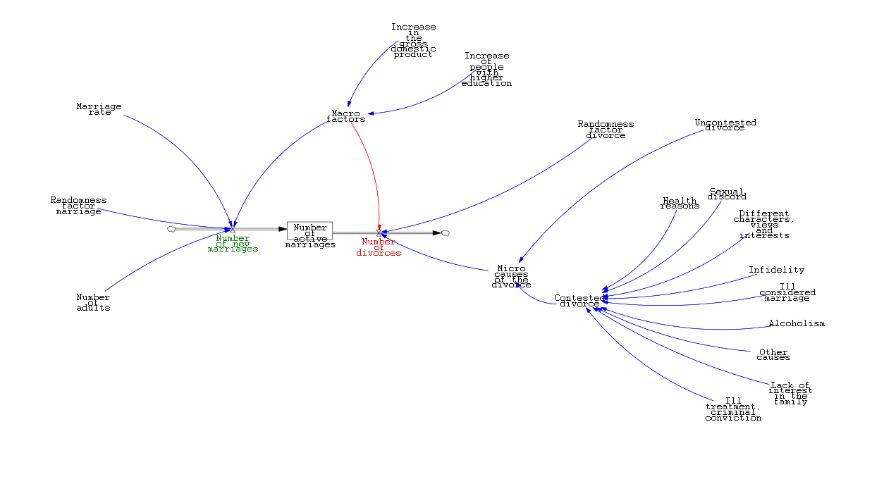 Finally, let us introduce the main parameters. Number of divorces is a calculation of the effect of the Macro factors on the number of divorces (calculated within the micro causes of divorce) with addition of the Randomness factor divorce.