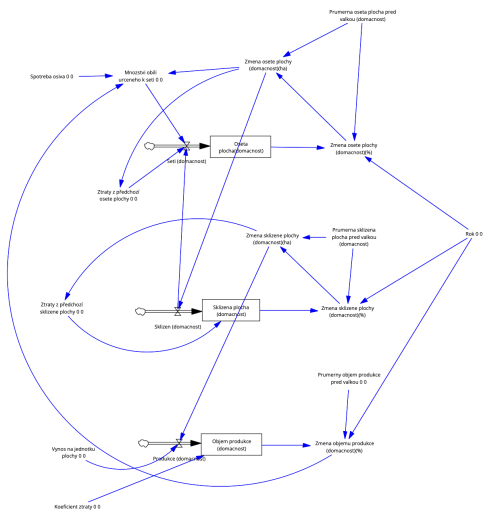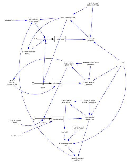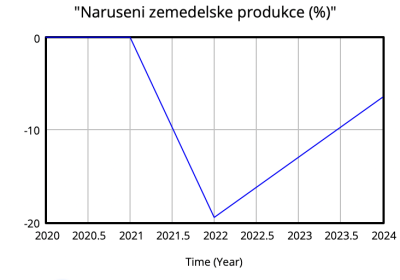 Válka představuje vážný a zásadní zásah do socioekonomických struktur společnosti, který má dalekosáhlé dopady na všechny sektory, včetně zemědělství. V konfliktních zónách je zemědělská produkce často vážně narušena, což má za následek nedostatek potravin, ztrátu příjmů pro farmáře a vážné ekonomické a sociální důsledky pro celou společnost. Cílem této simulace je analyzovat a předpovědět vliv války na zemědělskou produkci s použitím systémové dynamiky. Model se zaměřuje na kvantifikaci dopadů války na oseté plochy, sklizeň, objem produkce a odbyt obilí. Simulace má za cíl poskytnout důležité vhledy, které mohou pomoci v plánování humanitární pomoci, obnově zemědělské infrastruktury a strategiích pro zajištění potravinové bezpečnosti v postkonfliktních oblastech.