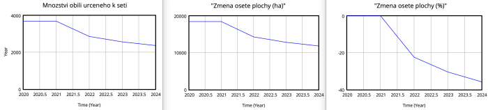 - Průměrná osetá plocha před válkou: Hodnota, která reprezentuje průměrnou velikost oseté plochy před začátkem simulovaného období, sloužící jako referenční bod pro srovnání a výpočet změn.