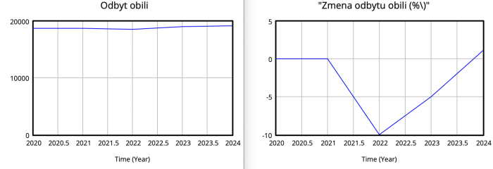 Model ukazuje, že zatímco některé proměnné jako odbyt obilí zůstaly relativně stabilní, jiné jako osetá a sklizená plocha vykazovaly výraznější fluktuace. Tyto výkyvy odrážejí vliv vnějších šoků a interních zásahů na zemědělský sektor. Výrazné narušení zemědělské produkce v roce 2022, jak ukázaly grafy, bylo následně částečně vykompenzováno obnovou v letech 2023 a 2024. Tento trend naznačuje schopnost sektoru adaptovat se a reagovat na narušení, ačkoliv plná obnova může být delší proces. Postupné zlepšení v objemu produkce a procentuální změně odbytu po prudkém poklesu naznačuje, že zemědělský sektor začal znovu nabírat na síle, což může být výsledkem úspěšných politik, zlepšení podmínek nebo technologického pokroku.