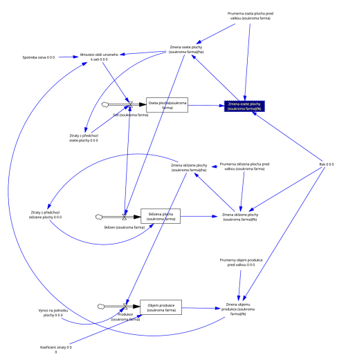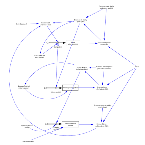 Obrázek, zobrazuje schéma systémového modelu, které ilustruje různé proměnné a jejich vzájemné vztahy v kontextu zemědělské produkce. Tento diagram je typický pro modelování systémové dynamiky, kde každý uzel reprezentuje proměnnou nebo proces a šipky ukazují, jak tyto proměnné interagují nebo se navzájem ovlivňují.