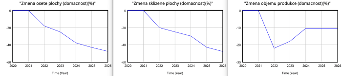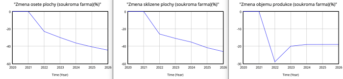 - Průměrná sklizená plocha před válkou: Průměrná velikost sklizené plochy před začátkem simulace, používá se k měření změn ve sklizni během simulovaného období.