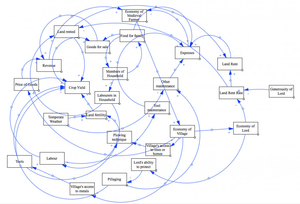 The model creates a huge number of feedback loops. For this reason, we will only look at the loops concerning the main variable of the model; Economy of Medieval Farmer. As the economy of the individual farmer positively affects the economy of the village, it is not surprising that Economy of Village is recurring in all loops concerning the farmer. The economy of the village allows the farmer to use tools, animals, it raises the price of goods, and positively affects the economy of the lord thus providing other benefits such as protection and lowered rent rates. It should be noted that the village’s economy has a much greater effect on the farmer’s economy, than vice versa. It should also be noted that farmers seldom were able to produce surpluses of note [16]. Normally, one-fourth of the harvest was used as seeds. Another one-fourth to two-fourths were paid as rent, and what was left was normally eaten. Economic growth was driven by farmers' ability to produce more than was consumed, which, up to the late middle ages, seldom happened. Also, even if one farmer’s economy is boosting, it might only have a marginal effect on the economy of the village. The model contains few negative feedback loops, but a large amount of positive feedback loops.