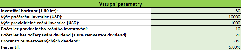 | Stručný popis | Investiční horizont | Počáteční investice | Pravidelná investice | Počet let pravidelné investice | Počet let bez odčerpávání dividend | Procento reinvestovaných dividend | |