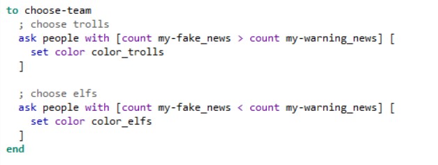 When I designed the model, I had very high hopes in a mechanism of changing teams in passing time. What I mean is those reactive rules controling the membership to team: when there is more fake news, agent is troll; when there is more warning news, agent is elf. I was very surprised to see that this mechanism didn't have any significant impact on the simulation. I hoped for emerging dynamic team changes, but this was really not the case. If there were even some changes, the numbers of changed agents was really low.