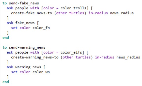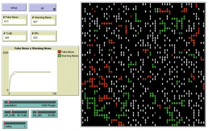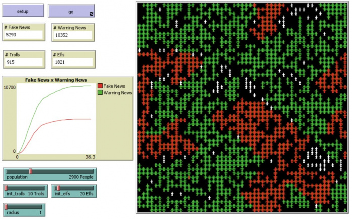 - If an agent has more warning news than fake news, agent becomes an elf and starts to send warning news to other people around.