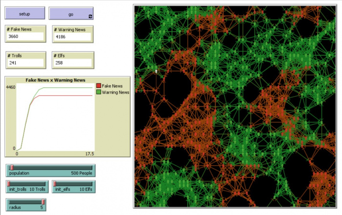 Fake news is a global problem and it is getting worse every year. Is it possible to stop fake news? Fake news are made by people named "trolls". These trolls make fake news and send them to other people. On the other side of the table are elfs, who defend people from fake news and send "fake news warnings". When people receive fake news, they have basicaly three choices: resend it as it is (basicaly become troll), resend it with "fake news warning" (become elf) or dont resend it. Can elfs beat trolls and defend the majority of system from fake news?