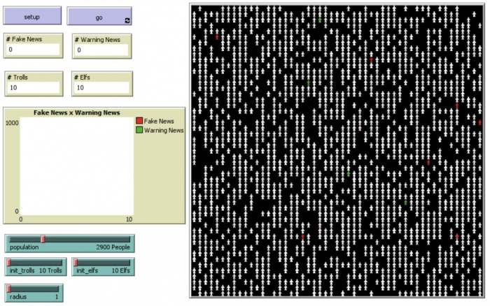 The simulation begins with a population of people and a certain number of trolls and elfs. When the simulation starts running, trolls and elfs start to spread fake or warning news. As these news are spread, the basic population of people starts to emerge into elfs and trolls themselfs. The simulation can stop, when there is no changes in emergence of population and the numbers of trolls and elfs are stable.