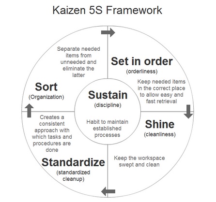 - ↑ Kaizen 5S Framework for Standard Business Processes. Project Management Software in the Cloud: project planning and tracking in Gantt task-tree - Comindwork [online]. 2014 [cit. 2015-06-18]. Dostupné z: http://www.comindwork.com/weekly/2014-07-07/productivity/kaizen-5s-framework-for-standard-business-processes