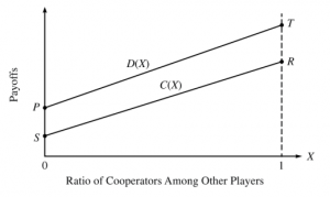 In this graph we can easily replace axis x – second player’s choice with ratio of cooperating agents in the rest of the group. This way we can apply graph on any size of a group, even again on two-player game. Last adding to the graph will be connecting point P with point T – creating “defectors’ payoff function” (D(X)), and also connecting letters S and R – creating “cooperators’ function” (C(X)). These function can have various shapes, don’t have to be linear, and can also go below zero. Look on this graph here:[3]