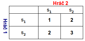 | Tip: Nashovo equilibrium je velmi snadné určit. Pokud v buňce je hodnota ziskové funkce pro prvního hráče maximem sloupce a hodnota ziskové funkce pro druhého hráče je maximem v řádku, tato buňka je Nashovým equilibriem. |