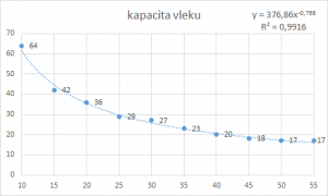 Je vidět, že maximální kapacita vleku má souvislost se šířkou sjezdovky. Dá se vyjádřit mocninou regresní funkcí Y=376,86x^(-0,788), s hodnotou spolehlivosti R^2=0,9916.