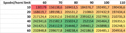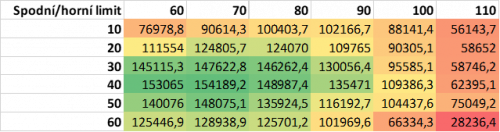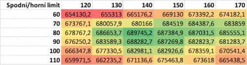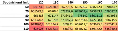 Na základě zprůměrování dílčích výsledků jednotlivých iterací byly vytvořeny tabulky nejpravděpodobnějších zisků za 3 roky pro dané kombinace limitů (viz níže). Nejvyšší zisky jsou znázorněny zeleně, nejnižší červeně.
