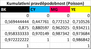 Co se expirace (stáří v době naskladnění) jednotlivých inkoustů týká, jedná se o Poissonovo rozdělení se střední hodnotou 2,49 měsíce (nejčastěji se příjímá na sklad inkoust 2 či 3 měsíce starý). Rozdělení pro jednotlivé barvy inkoustů znázorňuje graf níže.