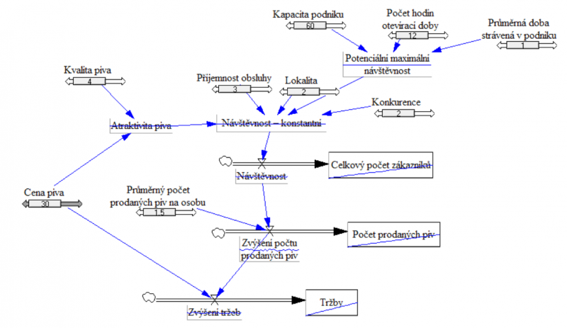 Vzorec: Potenciální maximální návštěvnost * IF THEN ELSE(Atraktivita piva >= 0.12, 1 , IF THEN ELSE( Atraktivita piva >= 0.1 , 0.95 , IF THEN ELSE(Atraktivita piva >= 0.8, 0.9 , IF THEN ELSE(Atraktivita piva >= 0.6, 0.8 , 0.7) ) ) ) * IF THEN ELSE(Příjemnost obsluhy = 3, 1 , IF THEN ELSE(Příjemnost obsluhy = 2, 0.9 , 0.8 ) ) * IF THEN ELSE(Lokalita = 3, 1 , IF THEN ELSE(Lokalita = 2, 0.5 , 0.3 ) ) / (Konkurence)