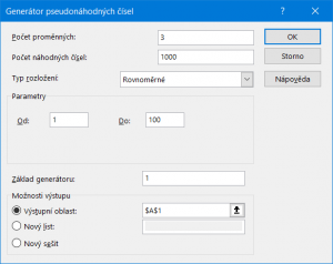 MS Excel obsahuje v sobě zabudovaný též generátor pseudonáhodných čísel. Jak bylo zmíněno výše (viz Mersenne Twister), pracuje na principu MT19937, což znamená, že jeho periodicita je po Failed to parse (MathML with SVG or PNG fallback (recommended for modern browsers and accessibility tools): Invalid response ("Math extension cannot connect to Restbase.") from server "https://en.wikipedia.org/api/rest_v1/":): {\displaystyle 2^{19937}-1} prvcích. Najdeme jej pod kartou Data a následně Analýza dat. Jedná se o doplněk, který musí být dodatečně dodán. Po kliknutí vybereme Generátor pseudonáhodných čísel. Následné okno je přizpůsobeno podle volby Typu rozložení. Co je ale společné, je počet proměnných (udává počet generovaných sloupců) a počet náhodných čísel (počet generovaných řádků). Pokud se pokusíme o rovnoměrné rozdělení, můžeme se podívat, jak tyto generátory fungují. Pro názornost byly vybrány 3 sloupce po 1000 čísel od 1 do 1000. Obrázky na pravé straně zachycují histogram z určitých intervalů. Můžeme vidět, že se algoritmus opravdu snaží o rovnoměrné rozmístění náhodných čísel. Jen tak pro zajímavost, směrodatné odchylky jsou pro první graf 28.72, pro druhý 28.08 a pro třetí 28.94. Vidíme tedy že algoritmus se opravdu držel nízké odchylky, přičemž ve druhé posloupnosti se mu to dařilo nejlépe a v poslední nejhůře. U třetího totiž upřednostňoval více čísla z inervalu 1-11. Pokud vyzkoušíme generátor například Normálního rozdělení, algoritmus opět hlídá rovnoměrnost dle nastavených parametrů. Opět ale každá řada vychází jinak. Narážíme zde na zmíněnou výhodu a nevýhodu zároveň, a sice opakovatelnost pseudonáhodných posloupností. Ať se mohou vygenerovaná čísla jevit jakkoliv náhodná, byla vypočítána algoritmem. Klíčové políčko je v nastavení generátoru Základ generátoru (neboli seed). Pokud vygenerujeme posloupnost např. 1000 čísel od 1 do 100 a zadáme základ například 3, při každém dalším pokusu se stejnými parametry a hlavně základem dostáváme opět tutéž samou posloupnost čísel. To je v různých oborech žádoucí a v jiných nikoliv.