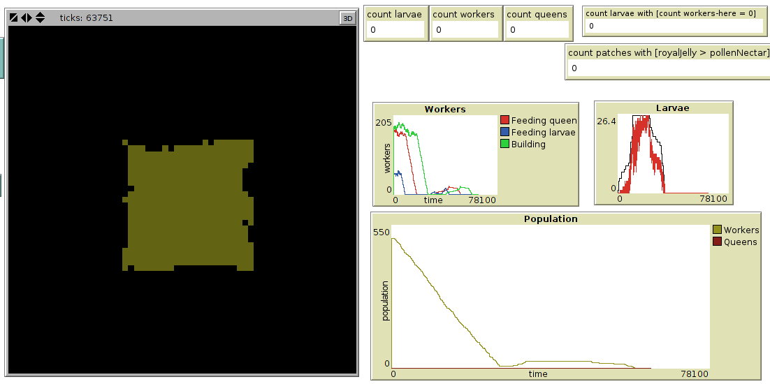 Kolónia nebola schopná živiť larvy, ktoré sa vyinuli. Okolo času 8500 (6 dní) už bol počet krmičiek lariev prakticky nulový. V čase 1800 (12.5 dňa) vyhynuli aj krmičky kráľovnej. Potom sa síce vykluli niektoré larvy, tie však už neboli nasledované ďalšou generáciou, keďže kráľovná už bola mŕtva a nebolo dosť potravy na to, aby sa vyvinula ďalšia kráľovná.