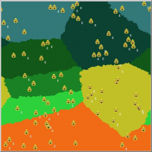 • Včelí úly: Včelí úly slouží jako "základna" pro akce všech včelích agentů. Kromě základních parametrů jako je pozice a velikost může mít přiřazenou královnu a využívá také několik pomocných proměnných.