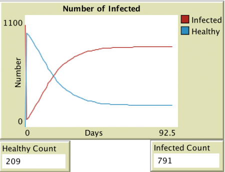 This goal of this simulation is to see how diseases spread among populations. It tries to find which factors are the most crucial in creating an epidemic. Under certain conditions a disease has the ability to be devastating to its affected population. For example, the Bubonic Plague is estimated to have killed 30% - 60% of the European population. This model aims to see how such a catastrophe could happen, and whether certain actions can be taken to avoid it.