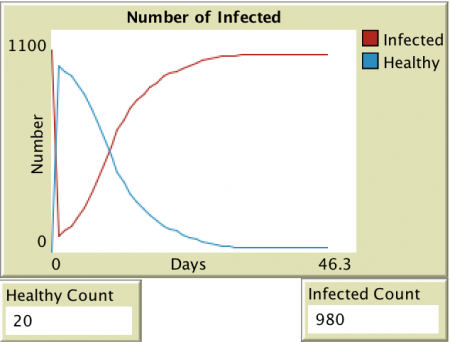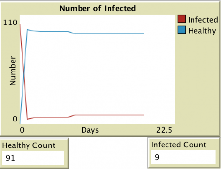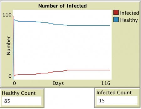 This case is similar to the first one with exception that there are only 100 humans, and there are only 5 patient zeros (5 %). There is 100% of infection, patients are contagious for 10 days, and there is no quarantine.