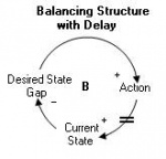 This loop is based on the previous one, except there is a delay, which plays a role in overall system responsiveness. The combination of the negative feedback and the delay in the system creates oscillations. The system is trying to achieve the target state, but because of delay, the system detects the information later. The system thus exceeds the target state.