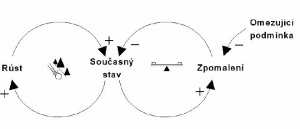 V praxi je téměř nemožné, aby pozitivní zpětná vazba trvala neustále a nemohlo dojít k nějakému stropu systému. Vždy existují nějaká omezení určující jisté hranice či meze. Systém, který se tváří jako čistě rostoucí tak může být pouze na kraji svého vývoje a hluboko pod hranicí omezení, to nic ale nemění na tom, že při exponenciálním růstu se meze dříve nebo později tak jako tak dosáhne. Pokud bychom se podívali na strukturu samotného archetypu uvedený na obrázku, tak nejdříve systém ukazuje prudký růst díky pozitivní zpětné vazbě a ve chvíli kdy dosáhne omezující podmínky, přebírá dominanci záporná zpětná vazba a dochází ke zpomalení růstu či jeho úplnému zastavení.