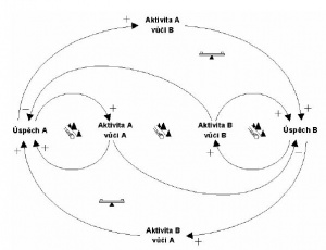 Archetyp řešící situaci, kdy spolupracující partneři se mohou díky snahám o svůj vlastní úspěch vzájemně poškozovat, případně být spolu dokonce konkurenty. Jak je vidět na obrázku, archetyp se skládá ze tří posilujících a dvou stabilizačních smyček. Celkový růst je pak řízen globální posilující smyčkou. Dále pak existují uvnitř systému dvě stabilizační smyčky, které jsou právě původcem omezení růstu.