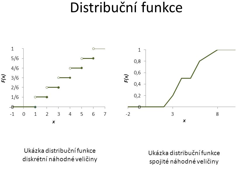 Distribuční funkce určuje pravděpodobnost, že náhodná veličina nabude hodnoty menší než x případně hodnoty x. Lze ji formálně definovat takto: Funkci FX : R → R definovanou vztahem FX(x) = P(X ≤ x) nazýváme distribuční funkcí náhodné veličiny X.
