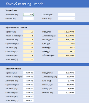 Model bude zpracován v rámci programu Microsoft Excel. Vstupem modelu bude nahlášený počet účastníků události a výstupem doporučený objem vstupních surovin. Významnou součástí bude analýza dostupných dat o objednávkách z již uskutečněných akcí, na základě které bude stanovena predikce objednávek budoucích.