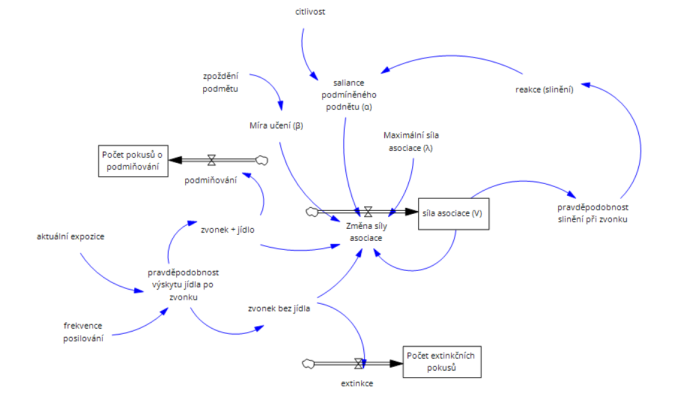 Pro simulaci byl zvolen přístup systémové dynamiky ve Vensim, který umožňuje sledovat, jak se v čase mění síla asociace mezi podmíněným podnětem (zvonkem) a nepodmíněným podnětem (jídlem). Jde o zjednodušený model klasického podmiňování, kde hlavní proměnná představuje míru naučenosti, tedy jak pravděpodobně pes zareaguje sliněním na zvuk zvonku. Vlivem opakovaného posilování (zvonek + jídlo) se tato proměnná zvyšuje, při absenci jídla klesá (extinkce). Model umožňuje sledovat, jak se tato míra mění v čase při různých scénářích, a je založen na známém Rescorla-Wagnerově modelu učení.