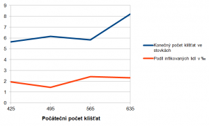 Nakonec bylo zkoumáno, jak závisí podíl infikovaných osob na počátečním počtu klíšťat, a to od počtu 425 do 635 s nárůstem po 70, pro každý daný počáteční počet klíšťat proběhla simulace 4x a po 4000 simulačních krocích. Dalo se i zde očekávat, že větší počáteční počet klíšťat přinese větší počet klíšťat v průběhu, potažmo na konci simulace a tím pádem větší počet nakažených osob. Výsledkem byl nakonec jen malý růst, nárůst počátečního počtu klíšťat o 49,4% způsobil růst infikovaných lidí o 19,6% (u krajních hodnot).