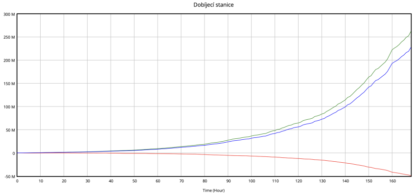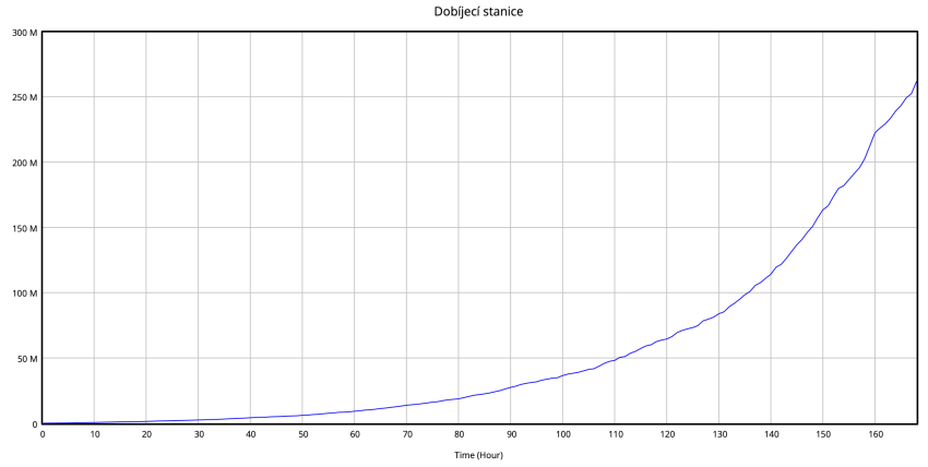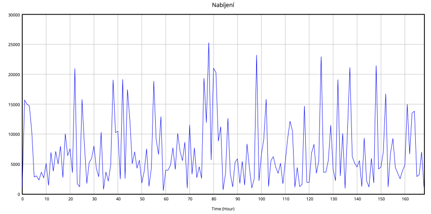 Po spuštění simulace s výchozími hodnotami model zobrazuje nutnost dobíjet v čase u elektromobilů v intervalu od 20 do 220.