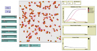 At the start a fixed number of infected and contagious people is given. The infection is indicated by setting the color of the person to red. For each healthy person is checked in each tick if there are any contagious persons within a certain radius. If infected persons remain within this radius for a sufficient time, the healthy person can become infected with a certain probability (inf-prob) per tick. If a person is infected he enters the incubation period indicated by changing its color to orange. After infection, a directed link is drawn from a randomly selected infected person present within the radius to the infected person. The incubation period length is derived from the log-normal distribution for each person. At the end of the incubation period the person becomes contagious for a given amount of time, derived from a moral distribution. After which the person recovers and becomes dies or becomes immune with a given probability. Death is indicated by a triangle. Immunity is indicated by a purple color.