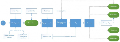 Outputs of cotton processing depends on different quality indicators which impact price of the product and eventually profit of the company. On the other hand, company supplies raw cotton from farmers based on the initial agreement before planting cotton and pays money based on the quality (trash level and moisture level) after harvesting. Initial agreement includes providing pesticides, irrigation systems, fertilizers, harvesting technologies and other agriculture services, which is calculated on a basis of cultivated land. As a problem, company should decide on the price (supplied raw cotton and output products) and estimate overall profit at the end of production cycles.
