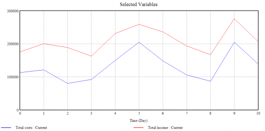Following graphs indicate income, cost and gross profit of the company after accepted raw cotton from 10 farmers. As can be seen, income and cost fluctates but generally presents increasing trend. Gross profit of the company is expected to reach around 800,000 USD.