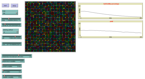 Insightful Findings and Images: The simulation generates a range of outputs that illustrate the intricate dynamics of agricultural production. Images captured from various simulation states can serve as compelling evidence of the model's capabilities and the scenarios it can depict, offering a visual representation of data that can be used for analysis or presentation.