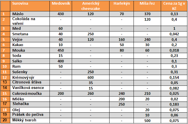 Tabulka surovin pro výrobu dortů. Ceny jsou podle: http://www.itesco.cz/ Receptura je podle http://www.nejkrasnejsidorty.cz
